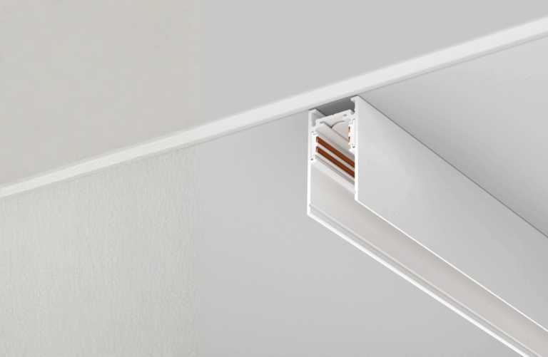 ✔ Montaj încastrat complet – profil invizibil în gips-carton (12,5 mm)Profil magnetic 48V – design minimalist, integrare perfectă și finisaj alb mat elegant